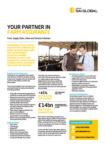 Intertek SAI Global is the most established farm assurance provider in the UK, and is highly trusted by farmers to help them on their journey to certification for schemes including Red Tractor, LEAF Marque and retailer specific programmes.