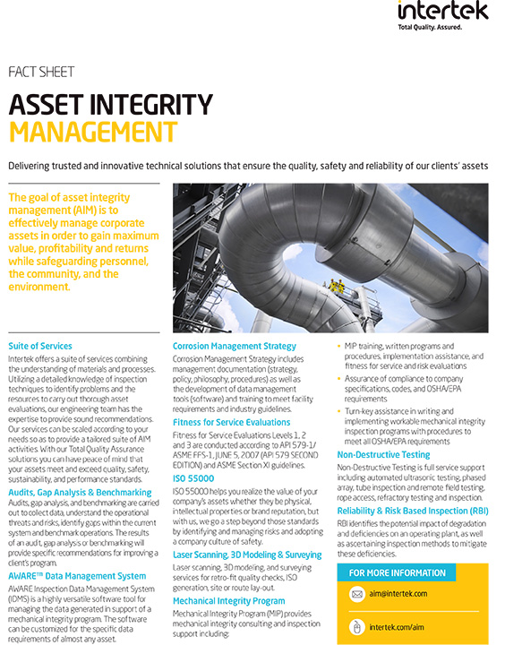 Intertek provides specialists and engineering support in all areas of Asset Integrity Management, including design, process safety, mechanical integrity, inspection and maintenance, operational and process support, corrosion, metallurgy, and risk analysis to provide you with Total Quality Assurance.