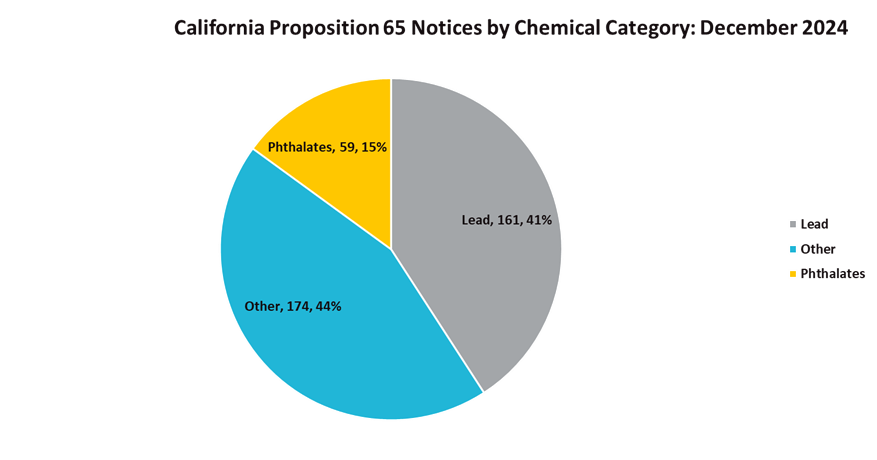 In December 2024, there were 394 60-day notices for violation of Prop 65, of which 41% of the notices served were for the category of Lead, 15% of notices were served for the presence of Phthalates, 44% of the notices were for the presence of other chemicals.