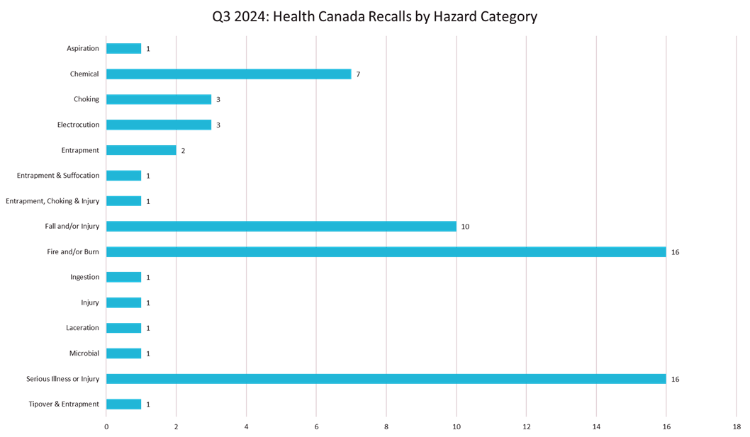 Health Canada reported a total of 56 consumer product recall notices issued in Q3 (July-September, 2024).